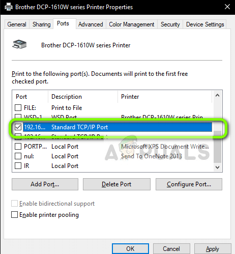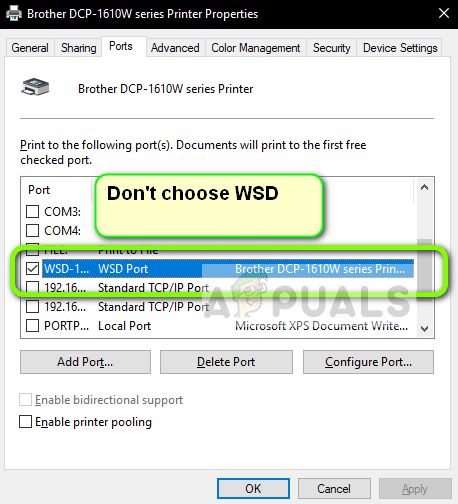 أيضًا عند اختيار المنفذ، تأكد من عدم تحديد منفذ WSD. من المعروف أن هذا يسبب مشاكل لطابعتك.