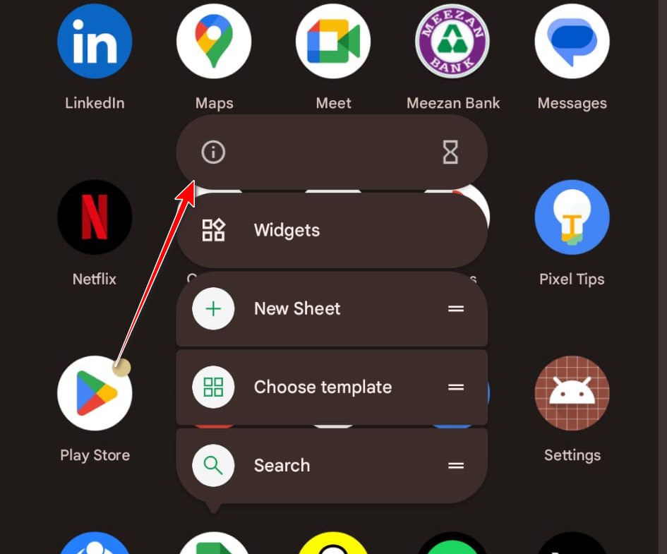 1. ابحث عن تطبيق Google Sheets، اضغط عليه مطولاً، ثم اضغط على أيقونة المعلومات.