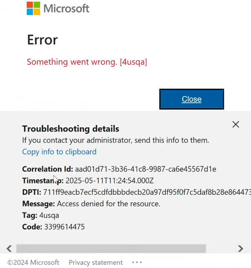 إذا استمر الخطأ حتى بعد هذه الفحوصات: اجمع سجلات تسجيل الدخول من Microsoft Entra > المراقبة > سجلات تسجيل الدخول للمستخدم المتأثر، وقم بالتصفية حسب ظهور TAG: 4usqa، واستخدم تلك التفاصيل (رموز الحالة وأسباب الفشل) عند التصعيد إلى فريق الهوية الداخلي الخاص بك أو دعم Microsoft.