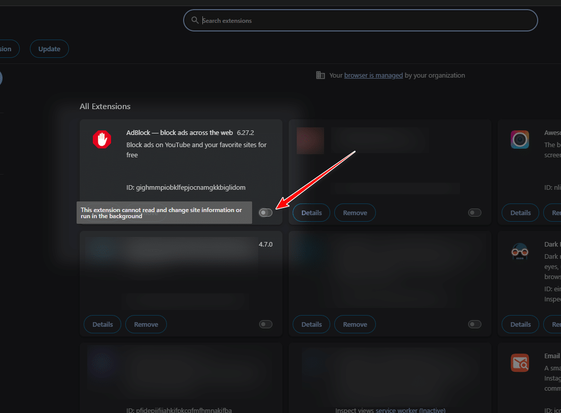 تؤكد تقارير المجتمع أن هذه المشكلة غالبًا ما تكون ناجمة عن تعارض إضافات حظر الإعلانات مع YouTube. نظرًا لأن YouTube يقيد بنشاط استخدام أدوات حظر الإعلانات، فإن تعطيلها يمكن أن يعيد التشغيل الطبيعي لمقاطع Shorts ويوقف التمرير التلقائي.