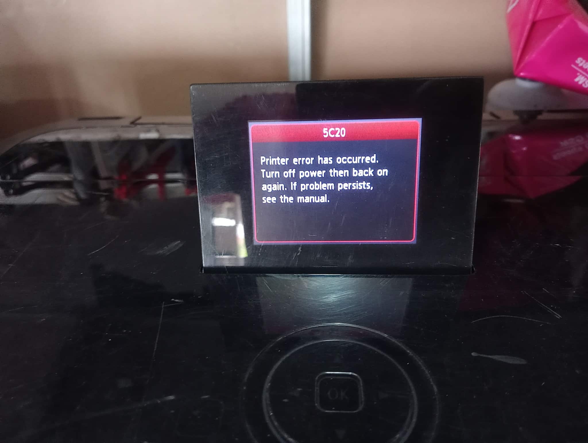 تتوقف الطابعة فجأة مع ضوضاء عالية (نقرات أو طحن) وتعرض رسالة الخطأ 5C20 على الشاشة. يشير هذا الخطأ إلى أن لوحة التحكم الخاصة بالطابعة لا تستطيع إدارة الجزء الذي يحرك خراطيش الحبر. عادةً ما يحدث هذا بسبب تلف لوحة التحكم.