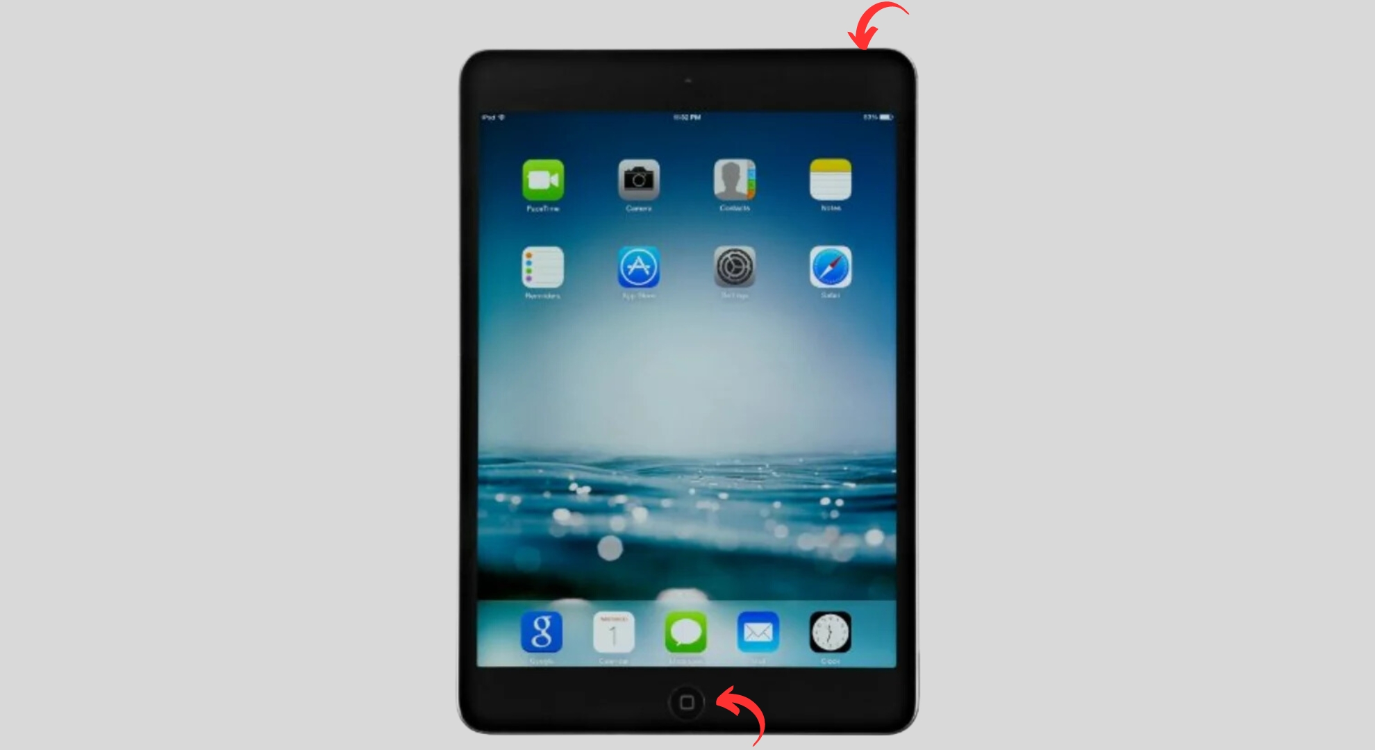 - لأجهزة iPad التي تحتوي على زر الشاشة الرئيسية (Home button) (و iPod touch الجيل السادس أو الأقدم): اضغط مع الاستمرار على الزر العلوي وزر الشاشة الرئيسية (Home button) في نفس الوقت حتى يظهر شعار Apple.