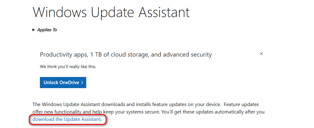 في بعض الأحيان، يفتقر إصدار Windows الحالي إلى مكونات التحديث المطلوبة أو يحتوي على ملفات قديمة يمكن أن تؤدي إلى ظهور هذا الخطأ. يؤدي تشغيل Windows Update Assistant إلى تحديث نظامك إلى أحدث إصدار، واستبدال الملفات التالفة أو المفقودة، وتحديث مكونات .NET التي يعتمد عليها Office. يخلق هذا بيئة أكثر سلاسة لعملية التثبيت.