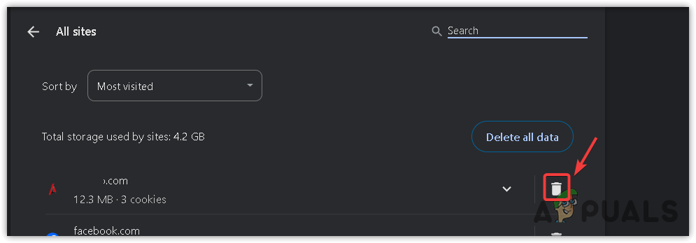 - ابحث عن paramountplus.com وانقر على أيقونة سلة المهملات لحذف البيانات.