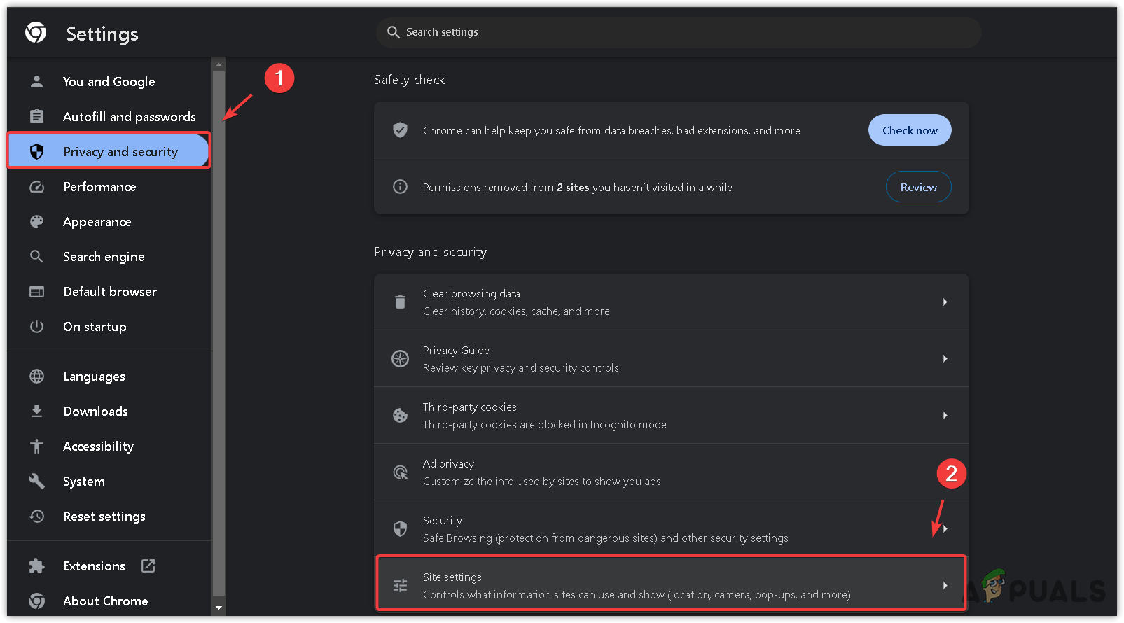 - انتقل إلى الخصوصية والأمان > إعدادات المواقع > عرض الأذونات والبيانات المخزنة عبر المواقع.