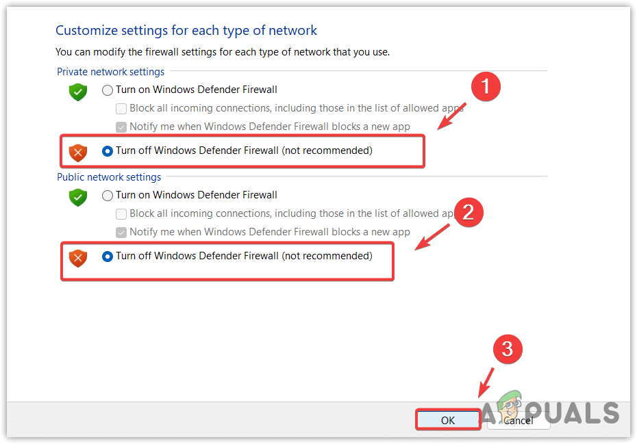 - حدد Turn off Windows Defender Firewall (not recommended) لكل من شبكات Private و Public.