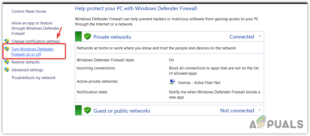 - اختر Turn Windows Defender Firewall On or Off من الجانب الأيسر للنافذة.