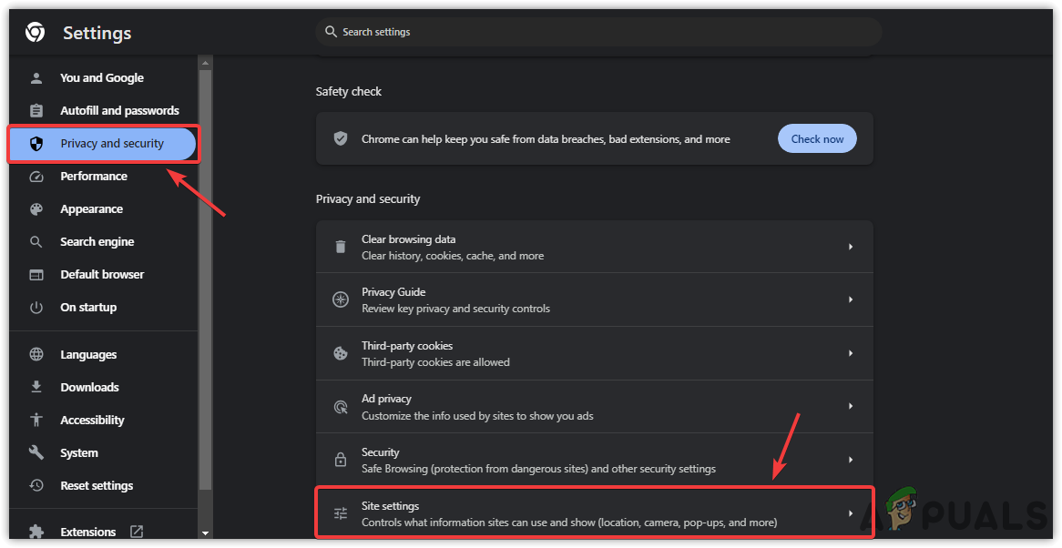 - من الشريط الجانبي الأيسر، اختر الخصوصية والأمان، ثم انقر على إعدادات المواقع.