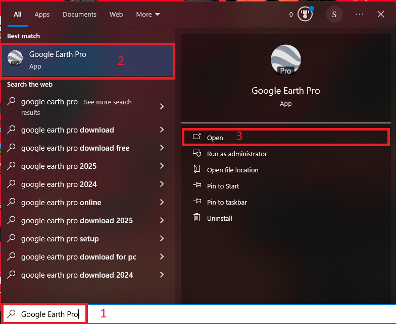 يؤدي تشغيل Google Earth من شريط بحث Windows إلى تجنب اختصارات سطح المكتب المعطلة ويضمن تشغيل Windows للملف التنفيذي من مجلد التثبيت الصحيح. يتجاوز هذا اختصارًا تالفًا أو قديمًا ويستدعي الملف التنفيذي من مجلد التثبيت. إذا حل هذا المشكلة، فأنشئ اختصارًا جديدًا لسطح المكتب من التطبيق قيد التشغيل.