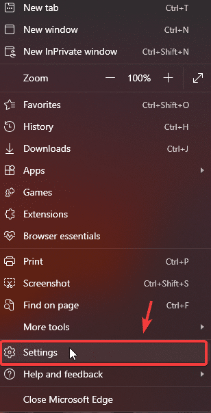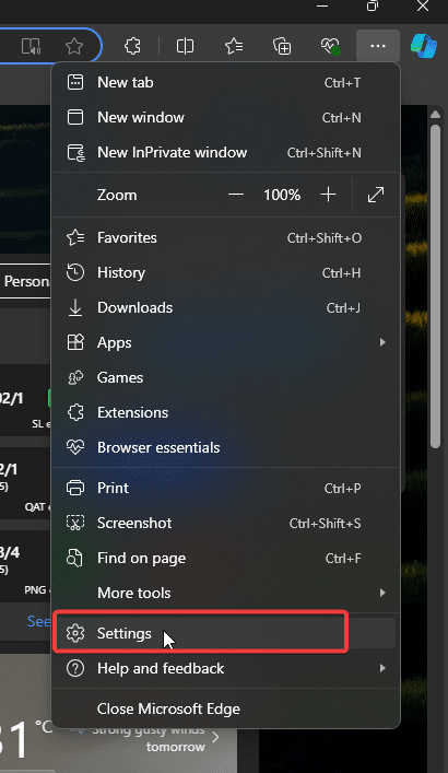- افتح Microsoft Edge، وانقر على النقاط الثلاث في الزاوية العلوية اليمنى، ثم حدد Settings.