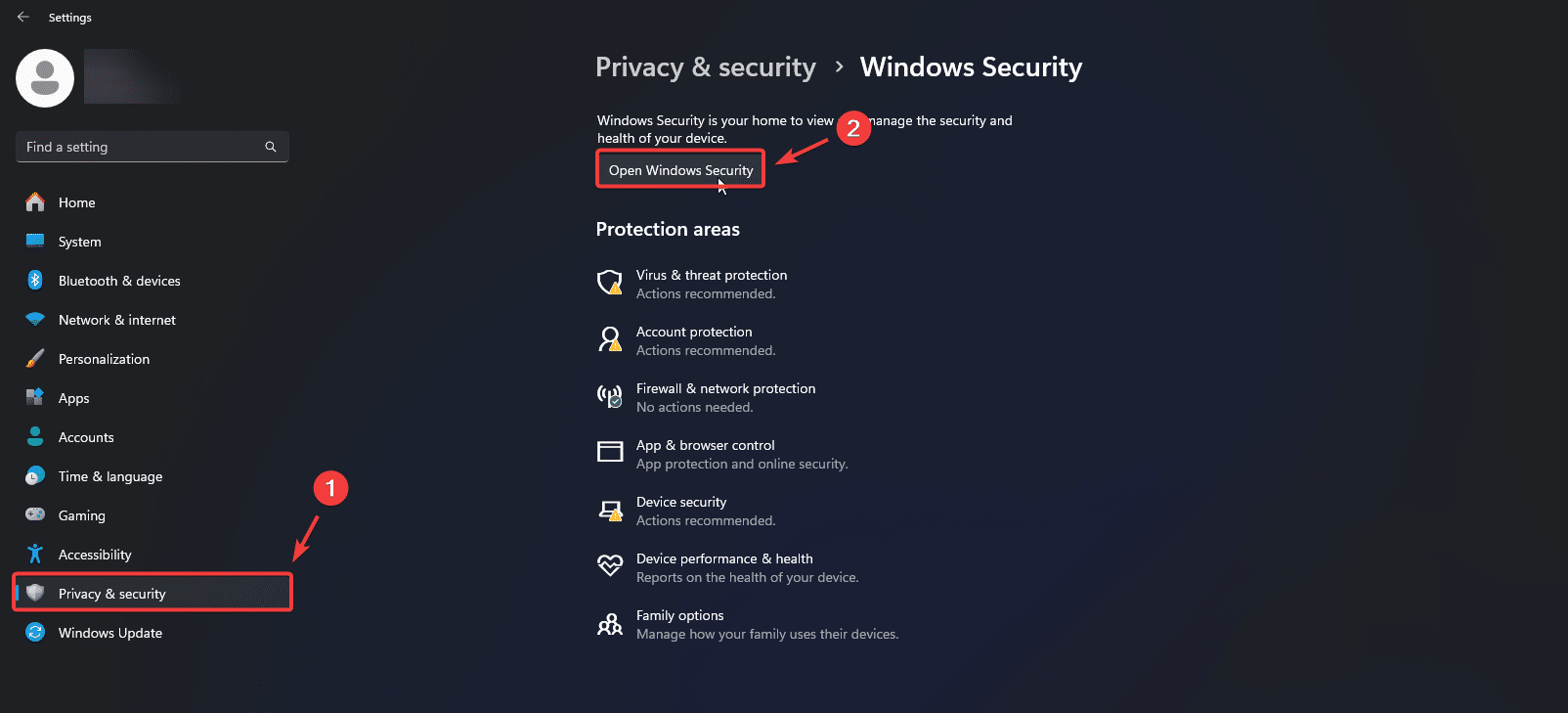 - انتقل إلى الخصوصية والأمان من الجزء الأيسر، ثم انقر فوق أمان Windows.