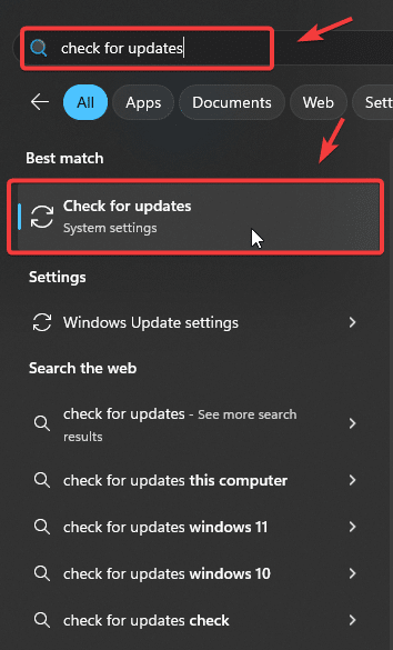 - لتحديثات Windows Updates، انقر على Start Menu واكتب Check for updates.