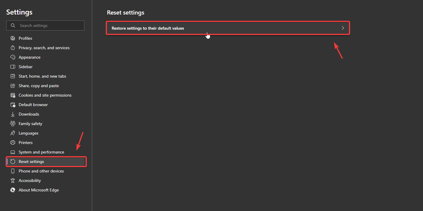 - من الجزء الأيسر، حدد إعادة تعيين الإعدادات وانقر على استعادة الإعدادات إلى قيمها الافتراضية.