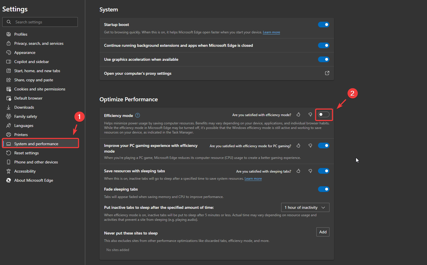 - قم بتمكين وضع الكفاءة ضمن تحسين الأداء.