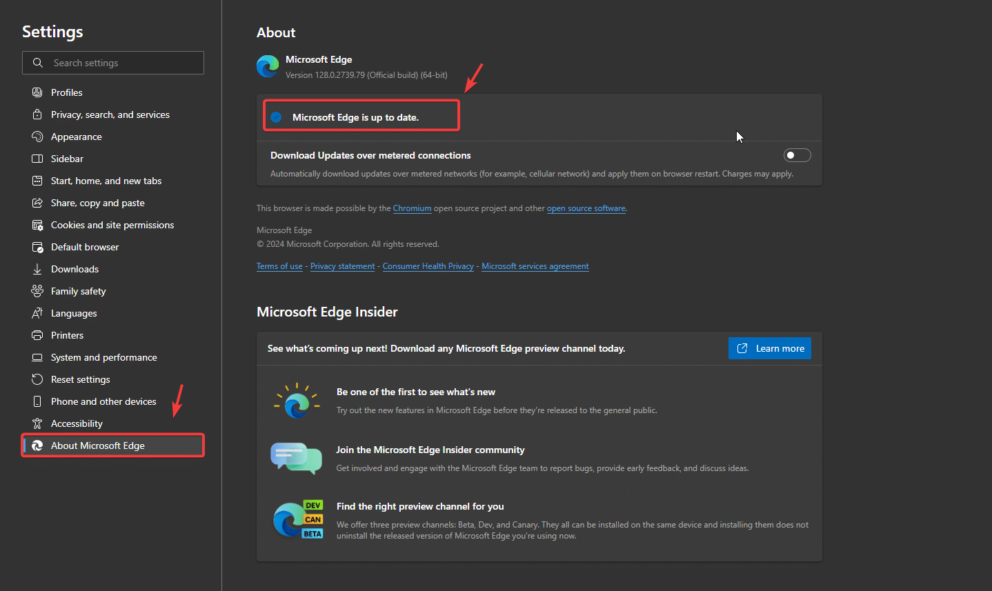 - حدد About Microsoft Edge من الشريط الجانبي الأيسر.