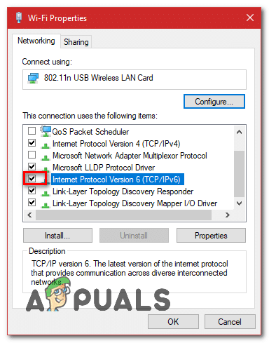 - قم بإلغاء تحديد مربع الاختيار أمام “Internet Protocol Version 6 (TCP/IPv6)”