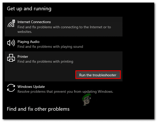 قبل تجربة أي من الإصلاحات الأخرى أدناه، يجب عليك تشغيل مستكشف الأخطاء ومصلحها للتأكد من أن المشكلة لا تنبع من مشكلة في طريقة تنظيم جهاز Windows 10 لمهام الطباعة الخاصة بك.