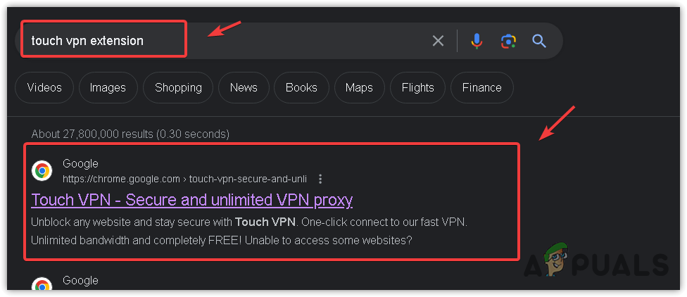 1. افتح علامة تبويب جديدة وابحث عن إضافة VPN. إذا كان لديك إضافة بالفعل، يمكنك الاتصال بشبكة VPN للوصول إلى Imgur. ولكن إذا كنت لا تستخدم VPN، فابحث عن Touch VPN أو أي VPN آخر تفضله للاتصال.