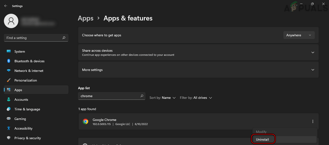 - ثم انقر على إلغاء التثبيت واتبع التعليمات التي تظهر على الشاشة لإلغاء تثبيت Chrome.