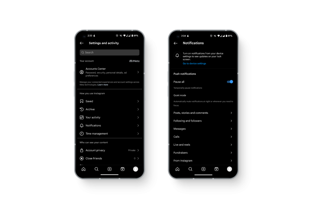 يحتوي Instagram على “وضع السكون” (Sleep Mode) الخاص به، والذي تم تصميمه لمساعدة المستخدمين على أخذ قسط من الراحة بعيدًا عن التطبيق. إنه يكتم الإشعارات ويرسل ردودًا تلقائية على الرسائل المباشرة. عند تفعيله، قد لا تتلقى أي إشعارات على حسابك.