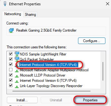 - حدد بروتوكول الإنترنت الإصدار 4 (TCP/IPv4) وانقر على خصائص.