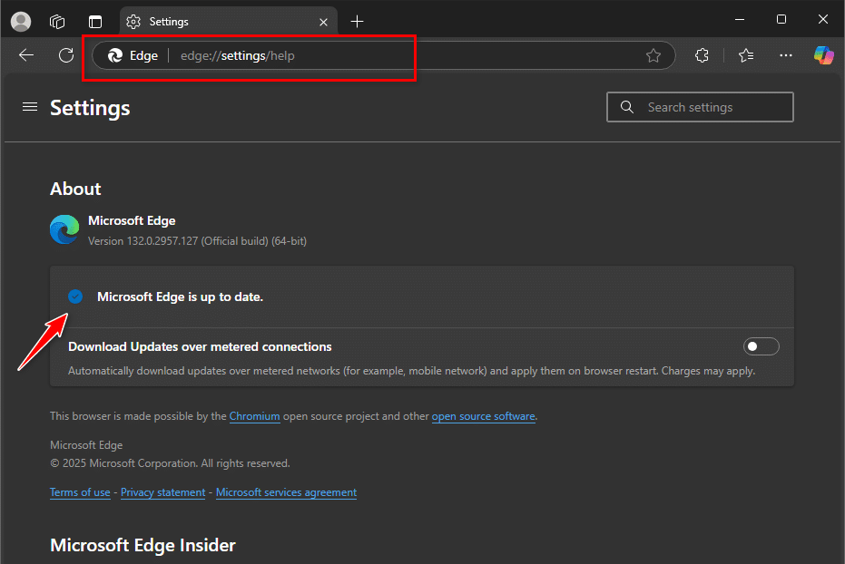 - انقر على قائمة النقاط الثلاث (أعلى اليمين) في Edge. ⇛ انتقل إلى الإعدادات ← حول Microsoft Edge لتشغيل التحديثات.