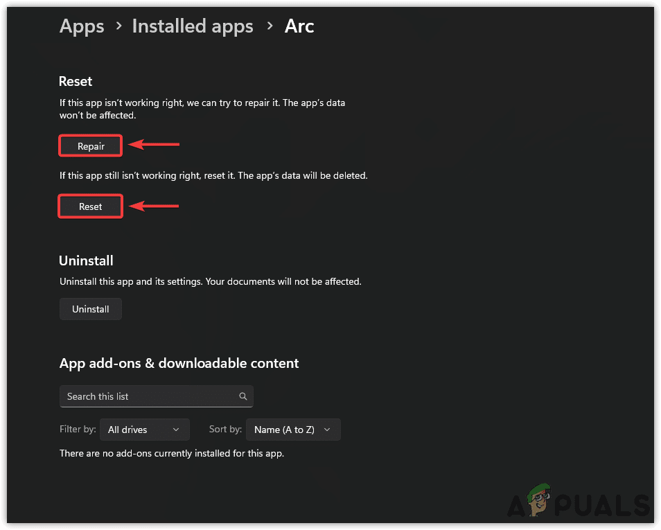 هناك أوقات تتلف فيها بيانات التطبيق، مما يؤدي إلى مشكلات مختلفة، خاصة مع Arc. لذلك، يجب أن تحاول إصلاح أو إعادة تعيين متصفح Arc لحل هذه المشكلة.