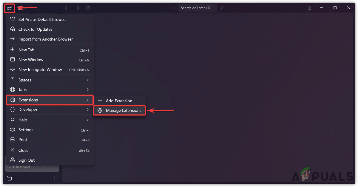 1. انقر على أيقونة Arc Logo من الشريط العلوي وحرك المؤشر فوق Extensions.