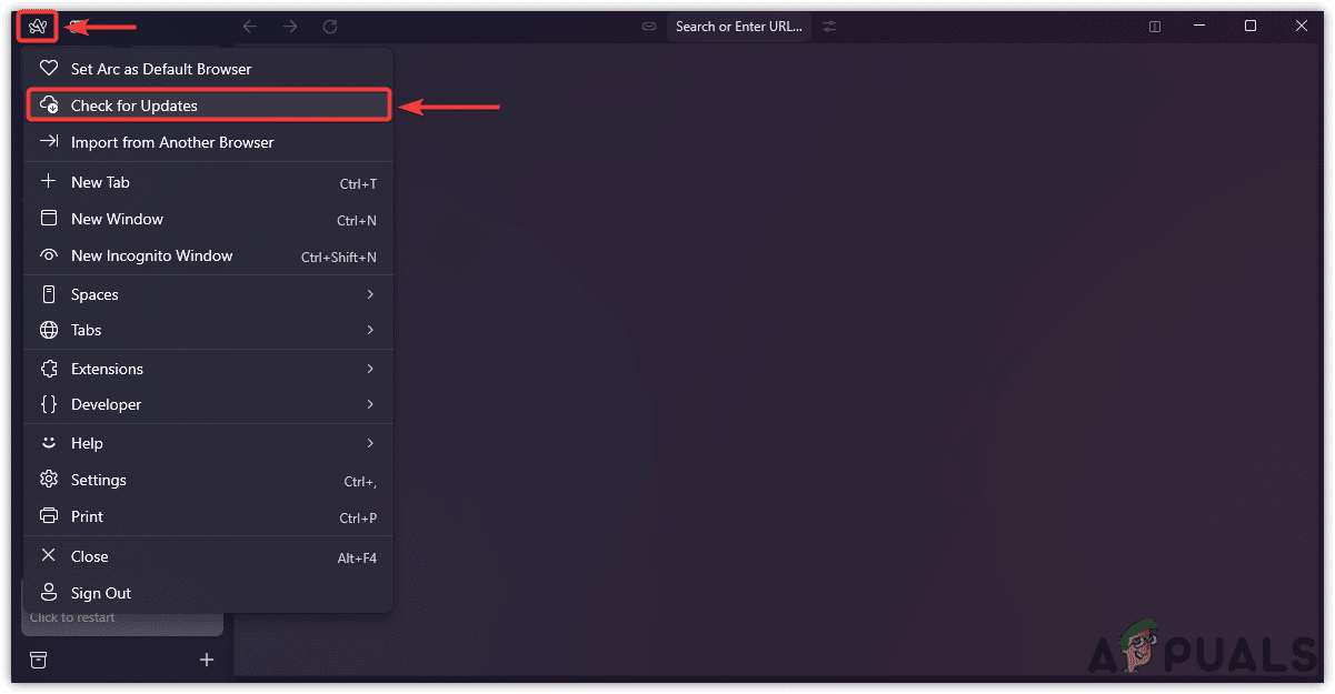 1. افتح تطبيق Arc، انقر على أيقونة Arc من الأعلى، واختر Check for updates.