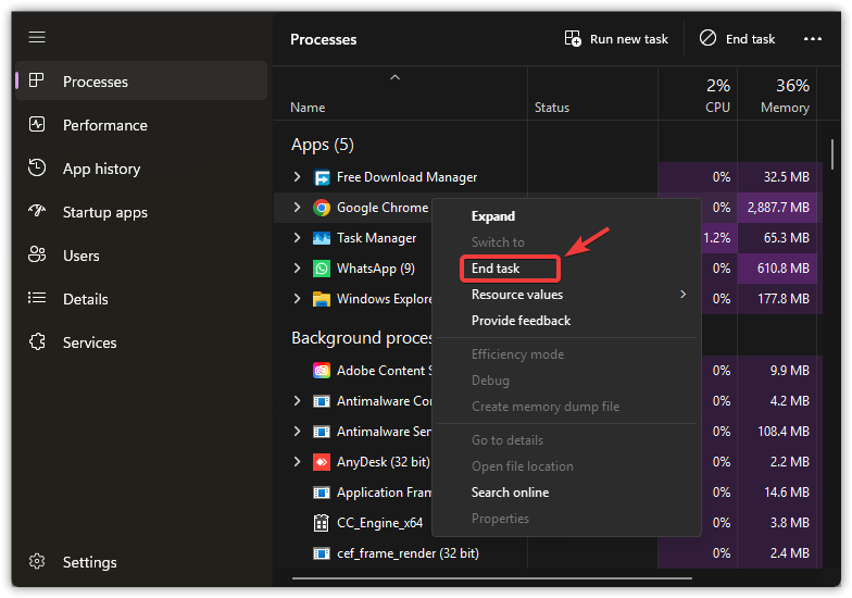 2. أغلق التطبيقات الثقيلة (خاصة المتصفحات)، أو قم بإنهاء المهمة لاختبار سريع.