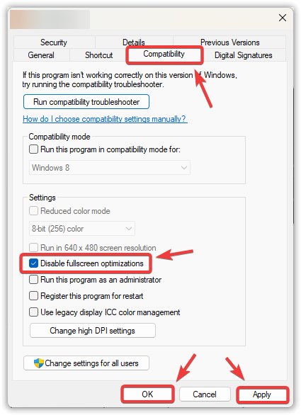 3. علامة التبويب التوافق ← ضع علامة على تعطيل تحسينات ملء الشاشة.