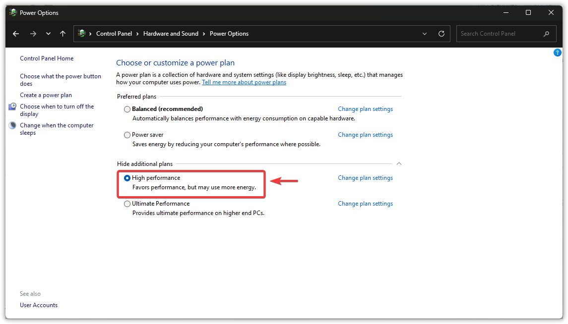 3. حدد High performance (أو Show additional plans إذا كانت مخفية).
