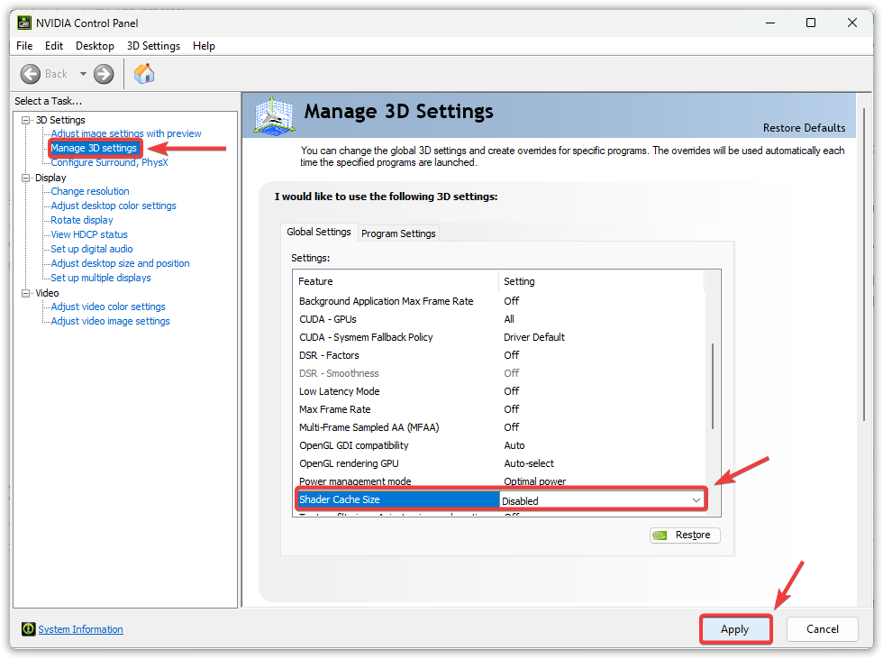 هام: يختلف اسم الإعداد حسب إصدار برنامج التشغيل (Shader Cache أو Shader Cache Size). بعض الإصدارات أيضًا لا تعرض خيار Disabled. إذا لم تتمكن من تعطيله، فاختر Driver Default وتابع.