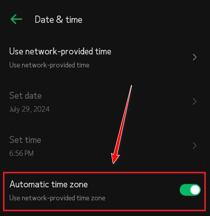 - تأكد من تمكين خيار المنطقة الزمنية التلقائية (يجب أن يكون مفعلًا).