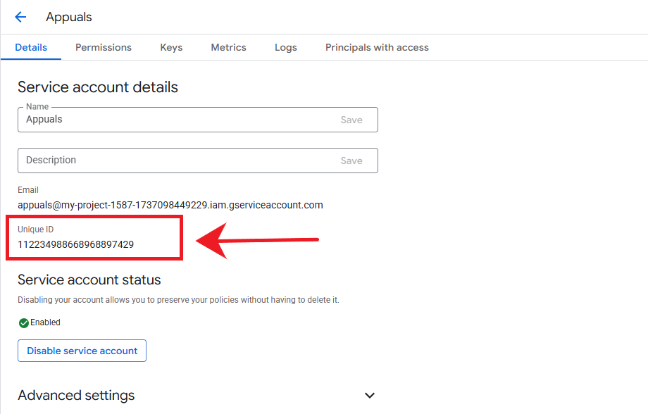 - انسخ المعرّف الفريد لحساب الخدمة.