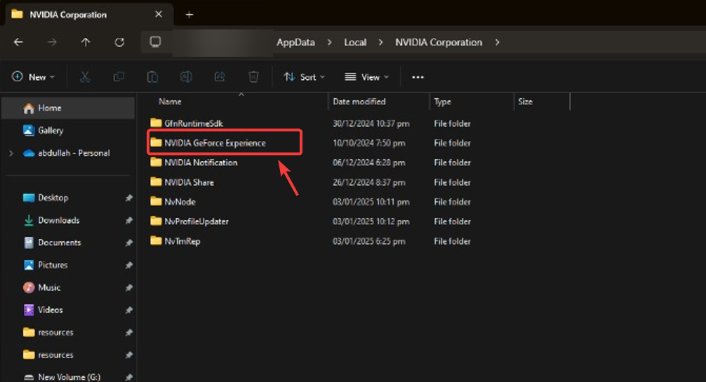 3. انتقل إلى Local > NVIDIA Corporation. هنا، حدد موقع مجلد GeForce Experience أو NVIDIA App واحذفه.