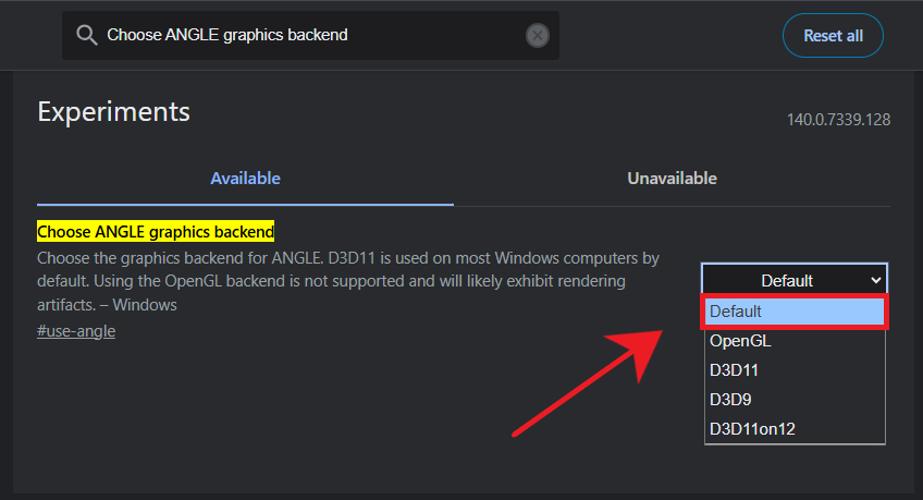 - ابحث عن “Choose ANGLE graphics backend” واضبطه على Default.