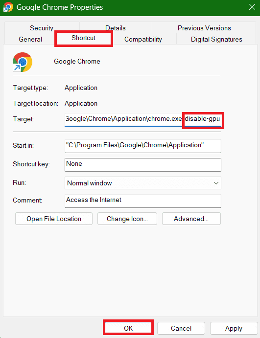 3. اكتب –disable-gpu في نهاية مربع النص الهدف.