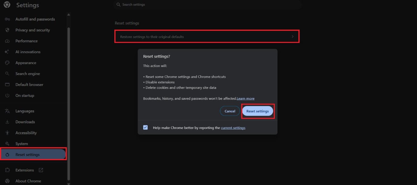 إذا كانت إعدادات Chrome غير صحيحة، فإن إعادة تعيينها يمكن أن يساعد. سيؤدي هذا إلى استعادة الإعدادات الافتراضية مع الاحتفاظ بالإشارات المرجعية وكلمات المرور المحفوظة.