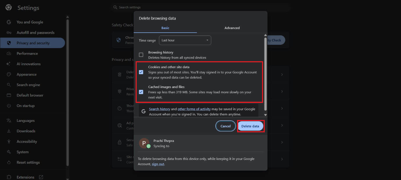 4. الآن، ضع علامة على ملفات تعريف الارتباط وبيانات المواقع الأخرى والصور والملفات المخزنة مؤقتًا.