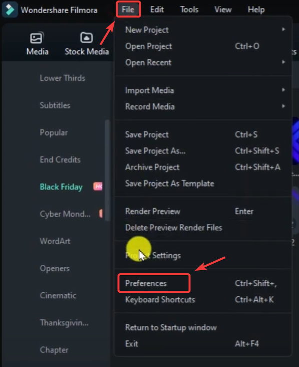 1. افتح Filmora ← ملفتفضيلات.