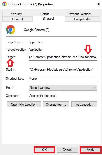 - شغل Chrome للتحقق مما إذا كان هذا يحل مشكلتك.ملاحظة: تعمل علامة ‘-no-sandbox’ على تعطيل ميزة Sandbox الأمنية في Chrome، لذا استخدمها كخطوة مؤقتة لاستكشاف الأخطاء وإصلاحها فقط.