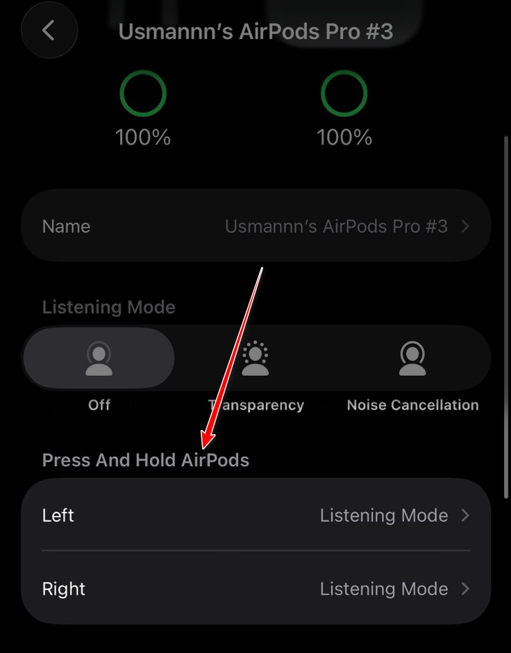 - غيّر الإجراء من Siri إلى خيار آخر (مثل التحكم في الضوضاء / وضع الاستماع) واختبر الميكروفون.