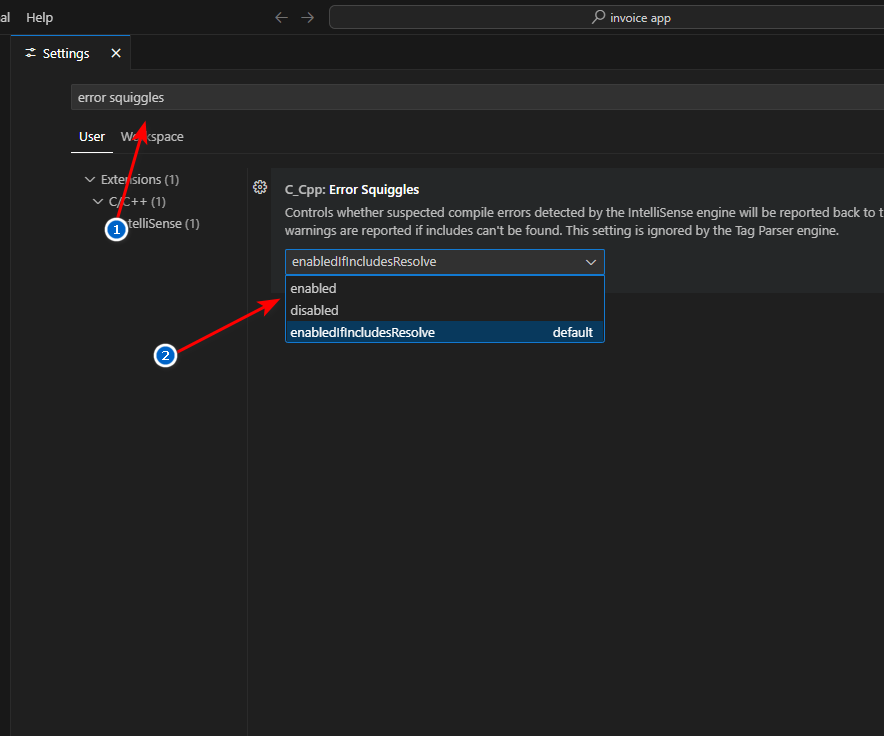 - اضبط خيار C_Cpp: Error Squiggles على enabled أو enabledIfIncludesResolve.
