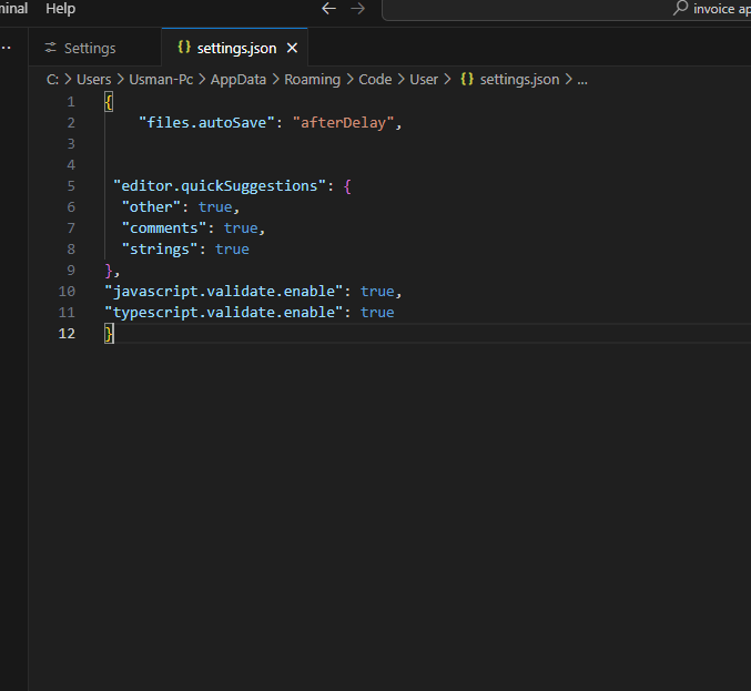 { "files.autoSave": "afterDelay", "editor.quickSuggestions": { "other": true, "comments": true, "strings": true }, "javascript.validate.enable": true, "typescript.validate.enable": true }![]()