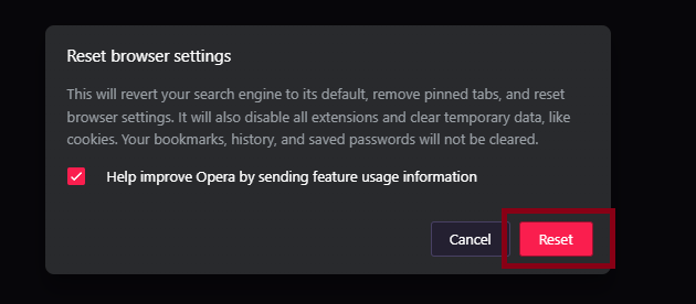 إذا كان المتصفح لا يزال لا يعمل بشكل صحيح، فقد يساعد إعادة تعيين إعدادات Opera GX إلى إعداداتها الافتراضية.