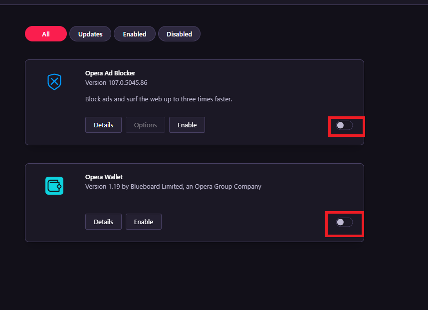 - قم بإيقاف تشغيل جميع الإضافات وأعد تشغيل المتصفح لمعرفة ما إذا كانت المشكلة قد حُلت.