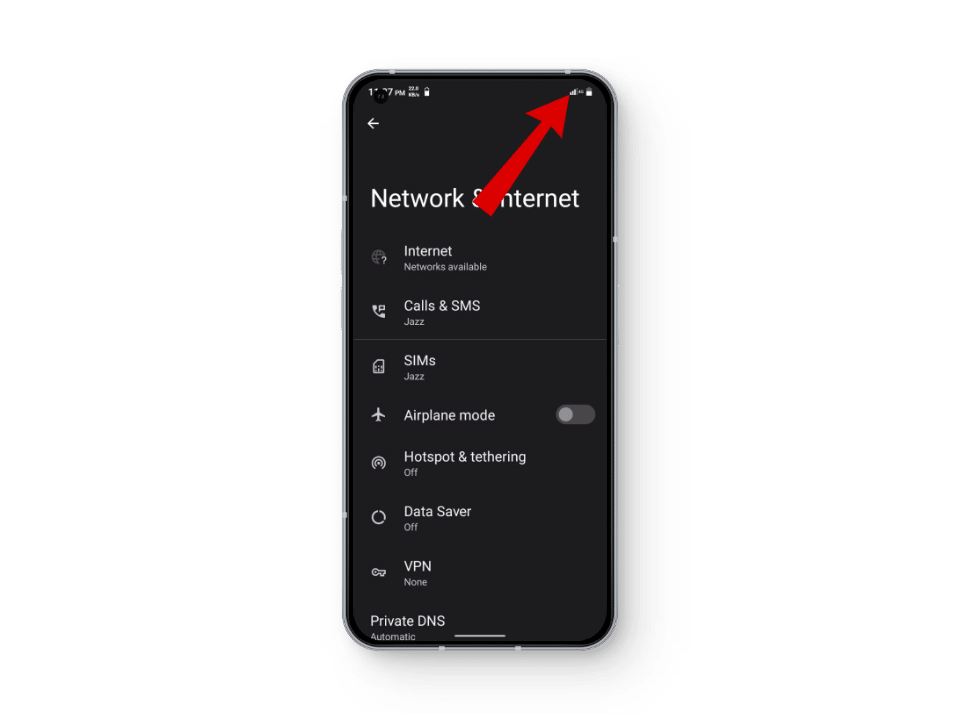 تأكد من أن اتصال شبكة هاتفك نشط ومستقر. يجب أن ترى بشكل مثالي ما لا يقل عن ثلاثة أشرطة أو أكثر على مؤشر قوة الإشارة لديك. يمكن أن تمنعك الإشارة الضعيفة أو انقطاعات الشبكة — بسبب الصيانة أو الأعطال أو التنشيط العرضي لـ وضع الطائرة — من تلقي أي رسائل SMS، بما في ذلك رموز التحقق. إذا كنت تشك في وجود مشكلة في الشبكة، قم بتبديل وضع الطائرة تشغيلًا وإيقافًا، أو اطلب من صديق إرسال رسالة إليك كاختبار سريع.