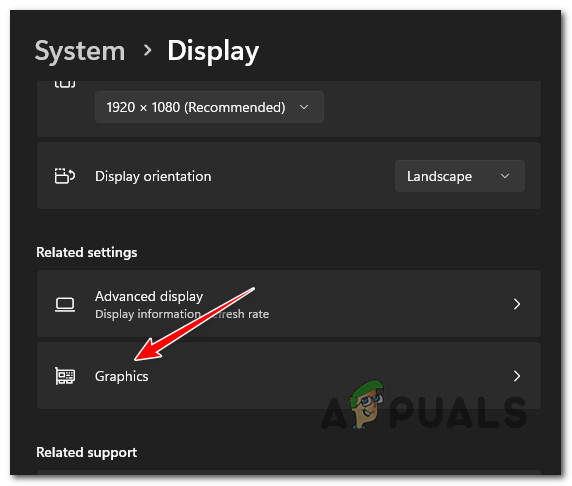 - داخل إعدادات Display، مرر لأسفل في قائمة الإعدادات وانقر على Graphics (ضمن Related settings).