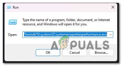 - بعد ذلك، اكتب ‘%windir%system32systempropertiesperformance.exe‘ واضغط على Ctrl + Shift + Enter لفتح قائمة Performance Options بصلاحيات المسؤول.